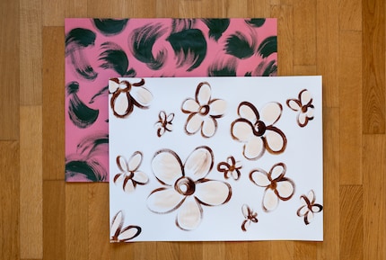 Kies papier - één voor de binnenkant en één voor de buitenkant. Zwaar papier zoals tekenkarton (ca. 300 g/m²) werkt prima, maar je kunt ook dunner papier gebruiken (ca. 250 g/m²). Ik koos voor (heel) lichtblauw en roze papier en schilderde het van tevoren met acrylverf.
